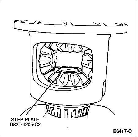 Install Step Plate D83T-4205-C2 (from D83T-4205-C) or equivalent in bottom side gear bore. Apply a small amount of grease to centering hole of the step plate.
