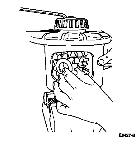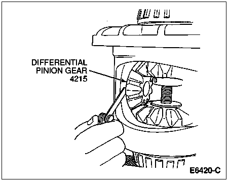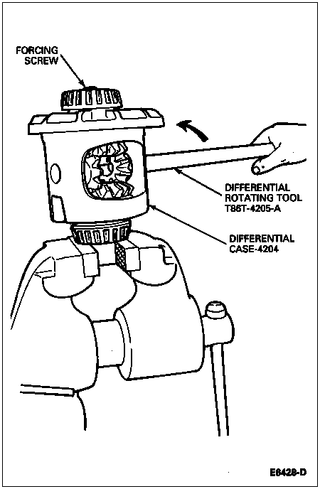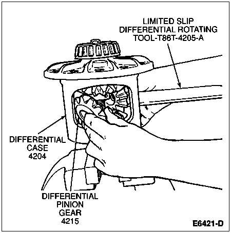 Insert Limited Slip Differential Rotating Tool T86T-4205-A in the pinion shaft bore and turn the differential case to "walk" the differential pinion gears out to the differential case windows.