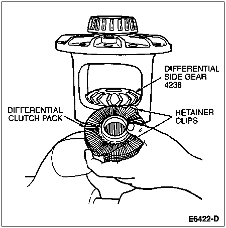 Remove the retainer clips from both differential clutch packs to allow separation of the clutch discs and clutch plates for cleaning and inspection. Refer to the disassembled view of the limited slip differential case at the beginning of this procedure.