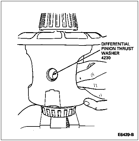 With an appropriate size feeler gauge, push the differential pinion thrust washers (4230) out from between the pinion gears and the differential case. Remove the differential pinion thrust washers, then back off the forcing screw until it is loose (approximately one turn).