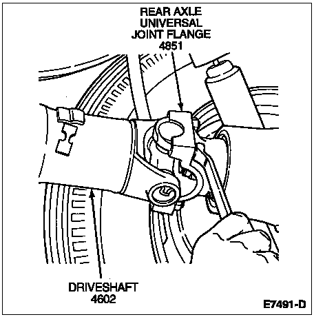 NOTE: Note and mark driveshaft/rear axle universal joint flange position so that it can be reassembled in the same position to minimize driveline vibration.