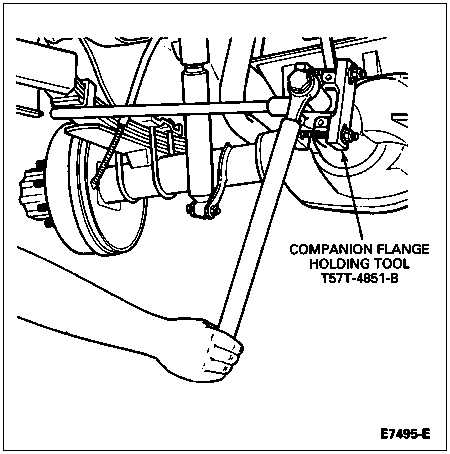 Using Companion Flange Holding Tool T57T-4851-B to hold the companion flange, remove the differential pinion shaft nut.