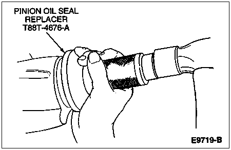 Clean the rear axle drive pinion seal seat. Coat the sealing edge of the new rear axle drive pinion seal with a small amount of hypoid gear lubricant or equivalent meeting Ford specification WSP-M2C197-A. Drive the rear axle drive pinion seal into the housing using Pinion Seal Replacer T88T-4676-A.