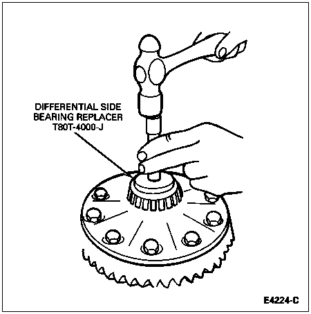 Install the differential bearing on the hub of the ring gear side of the case. Drive the differential bearing onto the hub using Differential Side Bearing Replacer T80T-4000-J.