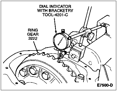 Force ring gear against drive pinion gear. Rock ring gear slightly to make sure gear teeth are in contact. Then, force ring gear away from drive pinion gear, making sure the dial indicator returns to zero. Repeat this procedure until the dial indicator reading is the same.
