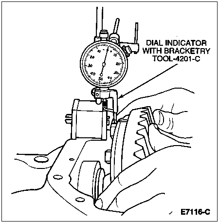 Assemble differential case into carrier (less pinion). Mount Dial Indicator with Bracketry TOOL-4201-C or equivalent as shown. Locate tip of indicator on flat surface of one of the ring gear bolt spot faces.