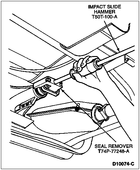 Remove extension housing seal using Seal Remover T74P-77248-A and Impact Slide Hammer T50T-100-A.