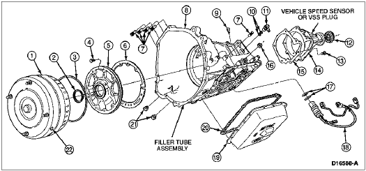 When a converter drain plug leaks, remove the drain plug with a six-point wrench. Coat the threads with Pipe Sealant with Teflon® D8AZ-19554-A or equivalent meeting Ford specification ESG-M4G194-A and install plug. Tighten the drain plug to 28-30 Nm (21-23 lb-ft). Fluid leakage from the converter housing may also be caused by engine oil leaking past the rear main bearing seal, or from oil galley plugs. Verify the exact cause of the leak before starting service procedures.