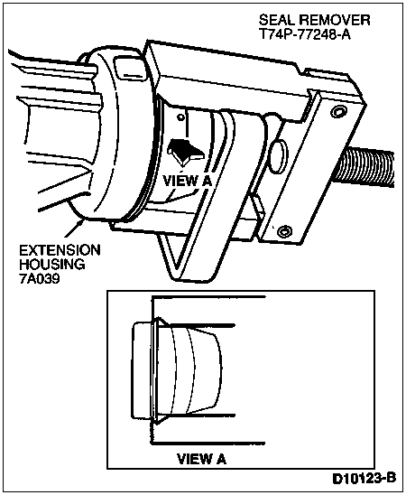 Remove extension housing seal using Seal Remover T74P-77248-A. Ensure seal remover lips are firmly seated under the flange on the extension housing seal.