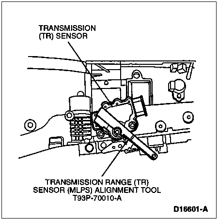 Insert Transmission Range (TR) Sensor (MLPS) Alignment Tool T93P-70010-A into slots. Align all three slots on transmission range sensor with three tabs on tool.
