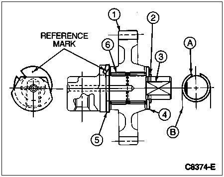 Install original reverse idler gear retaining ring onto reverse idler gear shaft. Insert a feeler gauge between reverse idler gear retaining ring and reverse idler gear and bushing to measure end play. Using the chart, adjust end play to 0.1-0.2mm (0.0039-0.0078 inch) by installing a reverse idler gear retaining ring of necessary thickness.