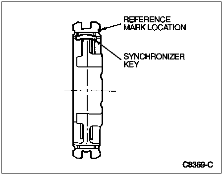 NOTE: When installing first/second synchronizer, make sure narrow width of sleeve faces second gear (front) side. Make sure reference marks face rear of transmission (7003); they reference installation position of synchronizer hub insert (7A044).