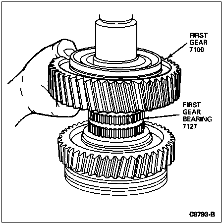Place the first gear over the first gear bearing. The clutching teeth on first gear must face upward.