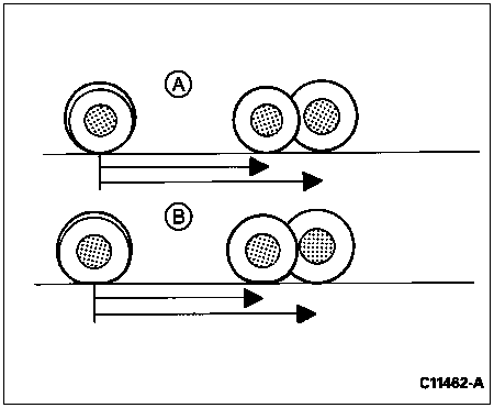 The following illustration shows that tires of even slightly different sizes roll different distances every revolution (see A). The same effect is true for tires that are the same size but inflated or loaded differently (see B). Operating a 4x4 in 4WD with tires of different size or inflation will produce driveline or torsional windup, even when driving straight ahead. If the vehicle is being driven in 4WD on dry, hard pavement, the driver will notice drag and may experience the hop, skip, bounce effect as the front or rear wheels release the windup.