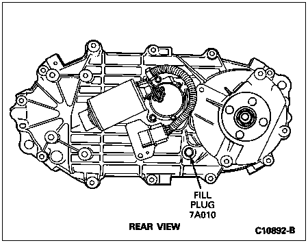 Remove the fill plug from the rear case (7005). Fluid level should be just below the fill plug hole. If the fluid level is below this level, fill with Motorcraft MERCON® automatic transmission fluid ATF XT-2-QDX or equivalent to the correct fill level. Reinstall the fill plug and tighten to 9-23 Nm (7-17 lb-ft).
