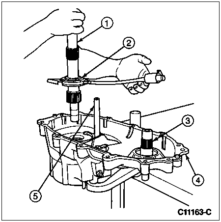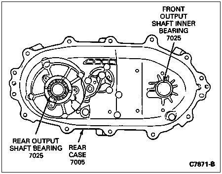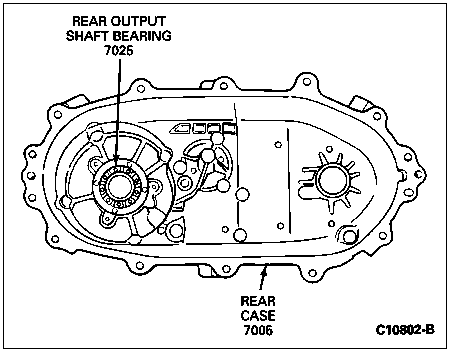 Press the rear output shaft bearing into position in the rear case using an appropriate tool. Install bearing snap ring retainer in rear case.