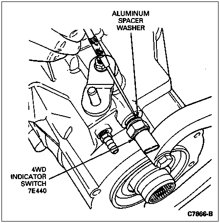 Remove the 4WD indicator switch and aluminum spacer washer from the transfer case. Do not lose this washer as it is required for the proper operation of this switch.