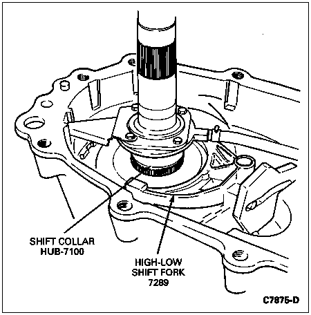 Install the shift collar. Install the high-low shift fork by engaging it with the shift hub flange and rotating it until the roller is engaged with the lower groove of the cam.