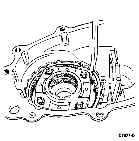 While supporting the front planet in position, install a new snap ring on the front side of the input shaft bearing, making sure that it is fully seated in the snap ring groove of the input shaft.