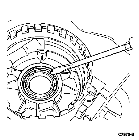 Remove the four No. 50 Torx® head bolts (7A443) securing the rear bearing retainer to the case. Pry the rear bearing retainer from the rear case using a 1/2-inch drive breaker bar between the pry bosses and separate and remove the rear bearing retainer from the case. Remove all traces of silicone rubber from the mating surfaces of the case and the bearing retainer.