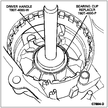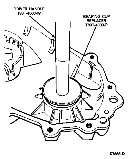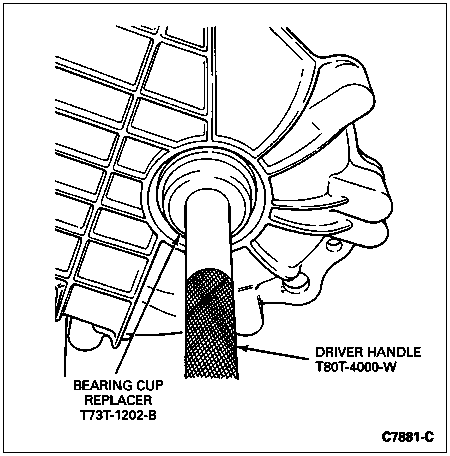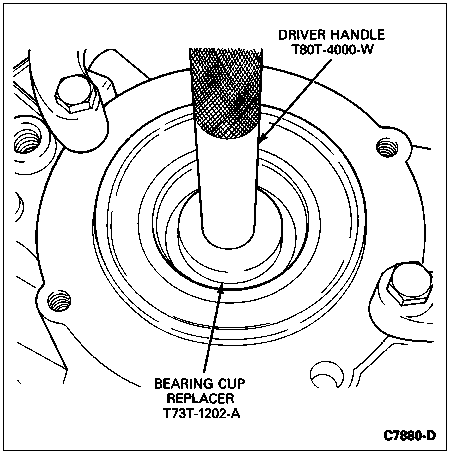 Drive the bearing out from the front of the case using Bearing Cup Replacer T73T-1202-B and Driver Handle T80T-4000-W.
