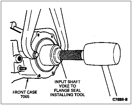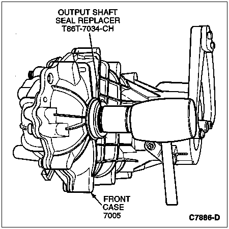 Drive the front output yoke to flange seal into the case until it is fully seated against the case using Output Shaft Seal Replacer T86T-7034-CH.