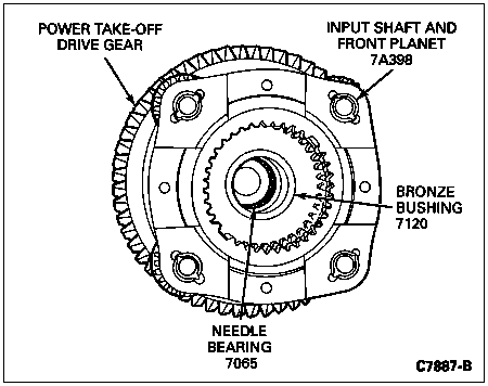 Reaching through the front opening with a pair of snap ring pliers, carefully expand the snap ring on the input shaft allowing it to drop out of the bearing. The front planet (7A398), including the input shaft, is serviced as an assembly only. If the bearing or bushing is to be replaced, drive out both of them through the input spline using suitable tools such as a brass drift and a small hammer, being careful not to damage the case.