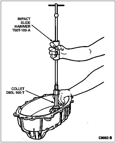 Remove front output shaft caged needle bearing from the rear case with Impact Slide Hammer T50T-100-A and Collet D80L-100-T from Blind Hole Puller Set D80L-100-A or equivalent.