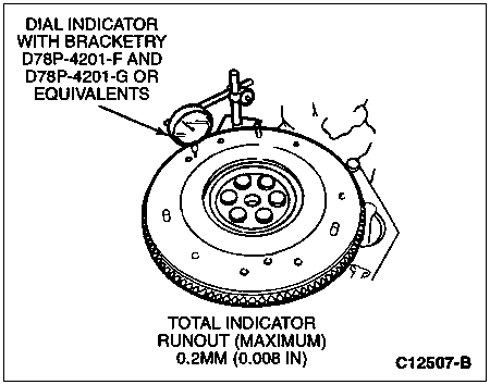 Install Dial Indicator with Bracketry D78P-4201-F and Dial Indicator D78P-4201-G or equivalents so that the indicator point contacts the flywheel (6375) face. Turn the flywheel, making sure to hold it in the full forward or rearward position so that the crankshaft end play will not be indicated as flywheel runout. To check crankshaft end play, refer to Section 03-00.