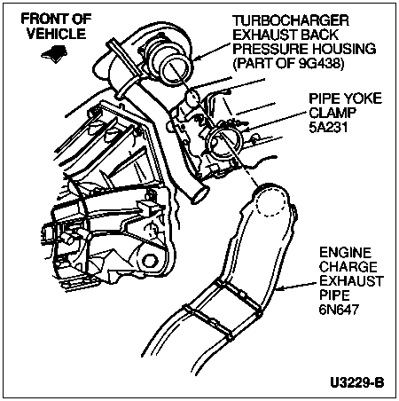 Loosen muffler inlet/outlet pipe yoke clamp (5A231) enough to remove engine charge exhaust pipe from turbocharger exhaust back pressure housing.