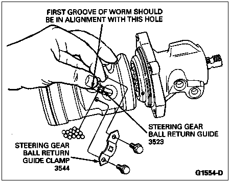 Place the steering gear ball return guide in the piston. Turning the power steering gear input shaft and control counterclockwise, place the same steering gear worm balls as were removed in the steering gear ball return guide. During assembly, 27 to 29 balls are required. If all the balls have not been inserted upon reaching the left stop, rotate the power steering gear input shaft and control in one direction then the other while inserting the remaining balls.