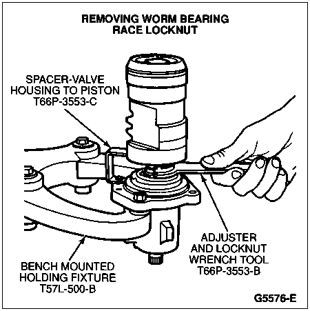 Install the power steering gear input shaft and control in the Bench Mounted Holding Fixture T57L-500-B and loosen the Allen head race lock nut screw from the valve housing.