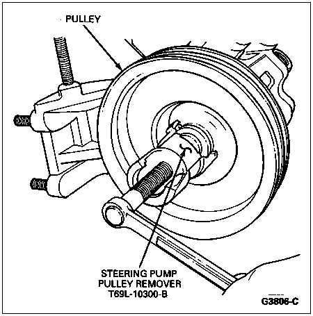 Remove power steering pump pulley with Steering Pump Pulley Remover T69L-10300-B.