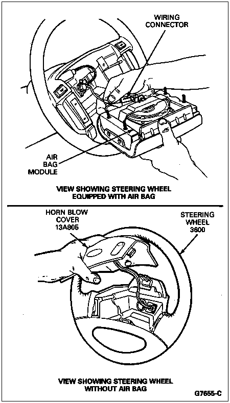 CAUTION: Do not remove the steering column, steering wheel (3600), steering wheel pad horn switch (13A805) and air bag module as an assembly from the vehicle unless the column is locked to prevent rotation. Lower end of steering shaft should be wired to prevent the steering wheel from being rotated.