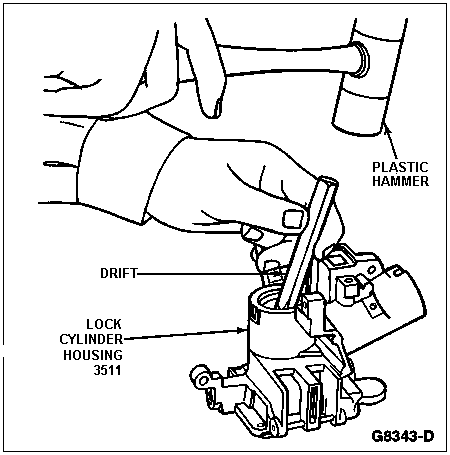 Set housing flat on workbench and tap steering column bearing loose with suitable drift and a plastic hammer.