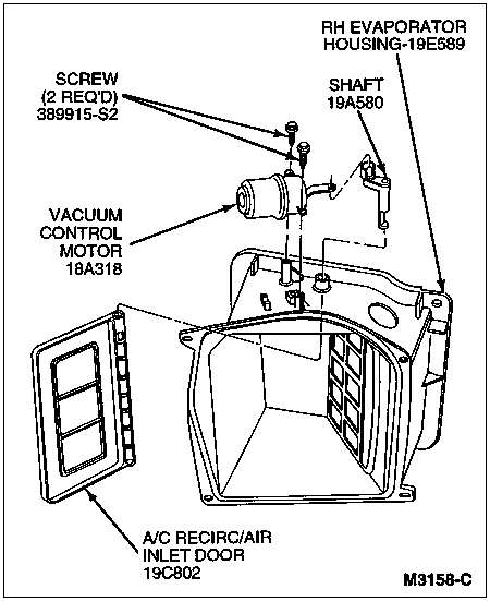 The outside air/recirculated air door is located in the A/C evaporator case (19897). It is operated by a vacuum control motor (18A318) in response to movement of the function air control knob (18519).