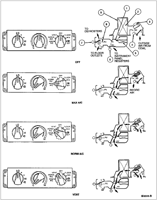 In the NORM A/C position, outside air is allowed to enter the passenger compartment. The air passes through the A/C evaporator core (19860) and is cooled before reaching the passenger compartment. Discharge is through panel register. A/C clutch is energized.