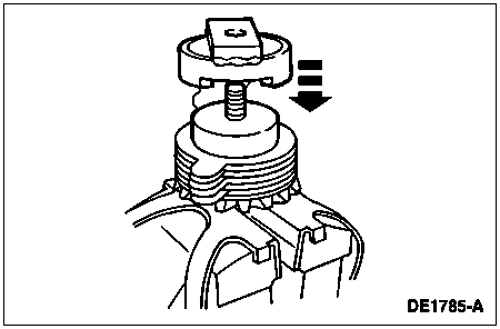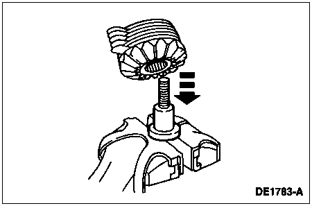 Install the Limited Slip Rotating Tool Nut D83T-4205-C or equivalent in the upper differential side gear (4236). Hold the Nut in position while installing the Limited Slip Rotating Tool Forcing Screw D83T-4205-C or equivalent. Tighten the hex-head screw until contact is made with the Step Plate Adapter D80L-630-8 or equivalent.