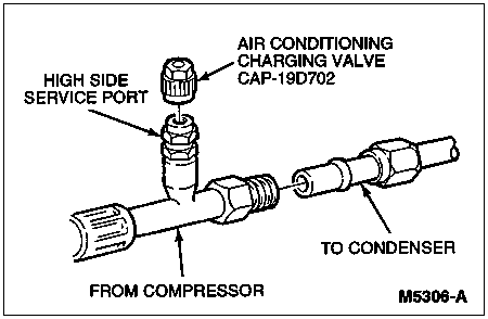 Always reinstall the A/C charging valve caps (19D702) on the service access gauge port valves after servicing the A/C system to prevent dirt from entering the valve or refrigerant system.