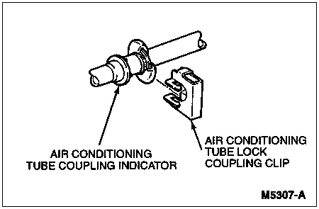 A plastic indicator ring is used on spring lock couplings to indicate, during vehicle assembly, that the coupling is connected. Once the coupling is connected, the indicator ring is no longer necessary but remains captive on the refrigerant line, near the spring lock coupling. The indicator ring may also be used for servicing purposes to indicate coupling connection. After the coupling has been cleaned, new green O-rings should be lubricated with clean refrigerant oil and installed. Insert the tabs of the indicator ring into the circular cage opening. Then connect the coupling together by pushing with a slight twisting motion. When the coupling is connected, the indicator ring will pop out of the circular cage indicating connection. Once the spring lock coupling is connected, an A/C tube lock coupling clip (19E746) is placed over the connection to act as a secondary retention holding device.