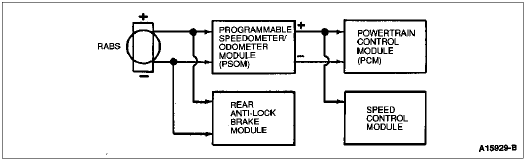 The Programmable Speedometer/Odometer Module (PSOM) receives input from the Rear Anti-Lock Brake Sensor (RABS) mounted on the rear axle differential. The PSOM sends this input signal information to the Speed Control module and the Powertrain Control Module (PCM).