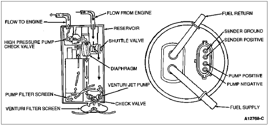 A portion of the high pressure flow from the pump is diverted to operate the Venturi Jet Pump. The Venturi Pump draws fuel from the tank into the assembly. This process ensures an adequate fuel supply to the pump during extreme vehicle maneuvers and steep vehicle attitudes with low-tank fuel fill levels.