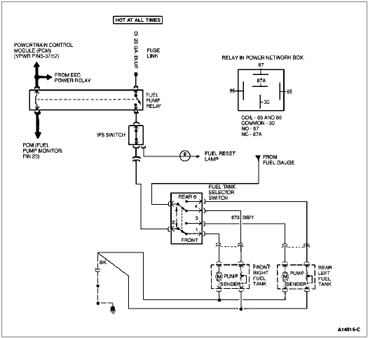 When the ignition is switched to the ON position, it turns the EEC Power Relay on. The EEC Power Relay provides power to the EEC-IV processor and the control side of the fuel pump relay. Power for the fuel pump is supplied through a fuse link or high current fuse attached to the starter solenoid (battery side). From the fuse link or high current fuse, current flow is through the fuel pump relay and Inertia Fuel Shutoff (IFS) switch to the fuel pump. The IFS switch is a safety device used to shut off the fuel pump in the event of a collision. If the IFS switch is "tripped," it must be reset by depressing the white or red button on the top of the switch. The fuel pump relay is controlled by the Powertrain Control Module (PCM).