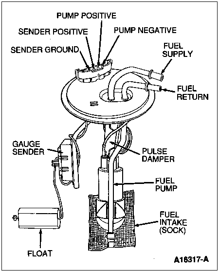 The in-tank fuel pump assembly (Figure 1) has a discharge check valve (to maintain system pressure during shutdowns and to minimize starting problems), an inlet screen for protection and fuel return provision. The pump on the 3.0L Taurus FF has an additional fuel line tap used for draining the tank.