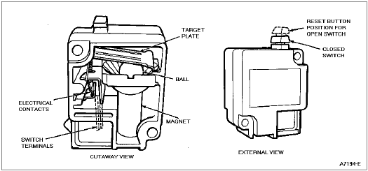 The IFS switch (Figure 4) is used in conjunction with an electric fuel pump. The purpose of the IFS switch is to shut off the fuel pump in the event of an accident. It consists of a steel ball held in place by a magnet. When a sharp impact occurs, the ball breaks loose from the magnet, rolls up a conical ramp and strikes a target plate which opens the electrical contacts of the switch and shuts off the electric fuel pump. Once the switch is open, then it must be manually reset before restarting the vehicle. Some vehicles have a fuel reset light. For the location of the IFS switch, refer to the Owner Guide.