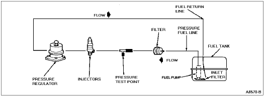 The Fuel Pressure Regulator (Figure 3) is attached to the fuel supply manifold assembly downstream of the fuel injectors. It regulates the fuel pressure supplied to the injectors. The regulator is a diaphragm-operated relief valve. One side of the diaphragm senses fuel pressure and the other side is connected to the intake manifold vacuum. Nominal fuel pressure is established by a spring preload applied to the diaphragm. Balancing one side of the diaphragm with manifold vacuum maintains a constant fuel pressure drop across the injectors. Fuel in excess of that used by the engine is bypassed through the regulator and returns to the fuel tank.
