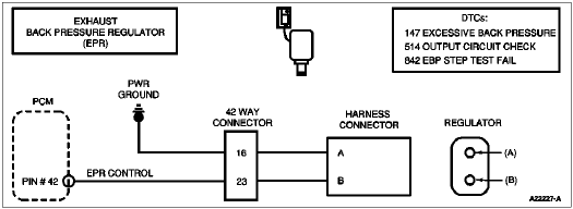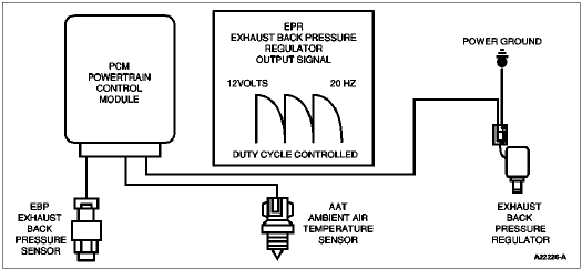 Exhaust Back Pressure Regulator — Is a variable position valve that controls exhaust back pressure during cold ambient temperatures to increase cab heat and decrease the amount of time needed to defrost the windshield. The PCM uses the measured exhaust back pressure, ambient air temperature and engine load to determine the desired exhaust back pressure injection control pressure.