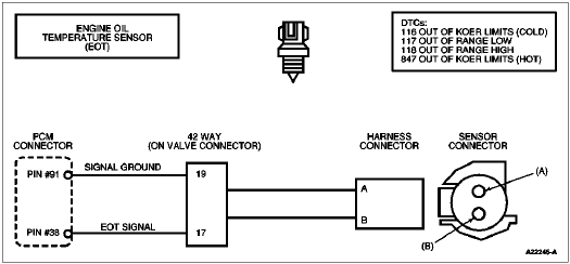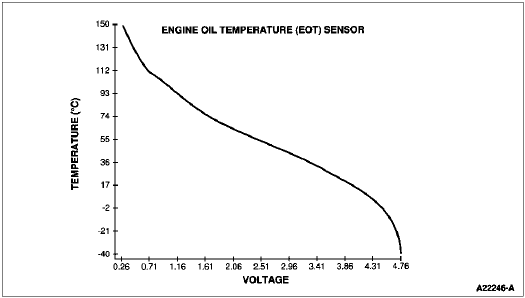 An EOT signal that is detected out of range (high or low) by the PCM will cause the PCM to ignore the EOT signal and assume an engine oil temperature of -29°F (-20°C) for starting and a temperature of 212°F (100°C) for engine-running conditions. The CHECK ENGINE light will also be illuminated as long as the condition exists.