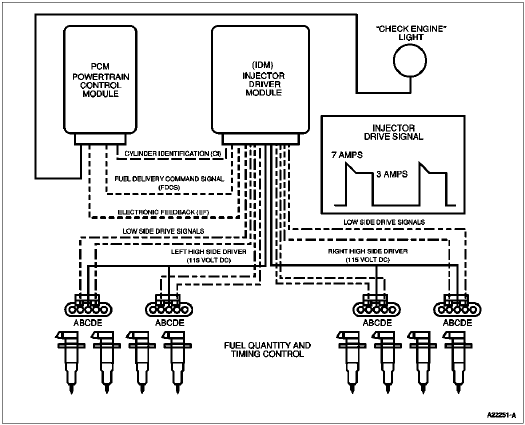 High Side Drive Outputs (Right and Left Bank) — The high side driver output function is to distribute energy to the proper bank based on CID and provide regulated current to the unit injectors, based on FDCS from the IDM internal 115V supply. The injection timing and duration is commanded by the PCM in the FDCS signal.