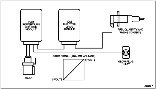 Glow Plug Control — The BARO signal (barometric pressure) is one of the variables used to calculate glow plug on time. At higher altitudes glow plug on time is increased to insure faster clean up of start-up smoke.